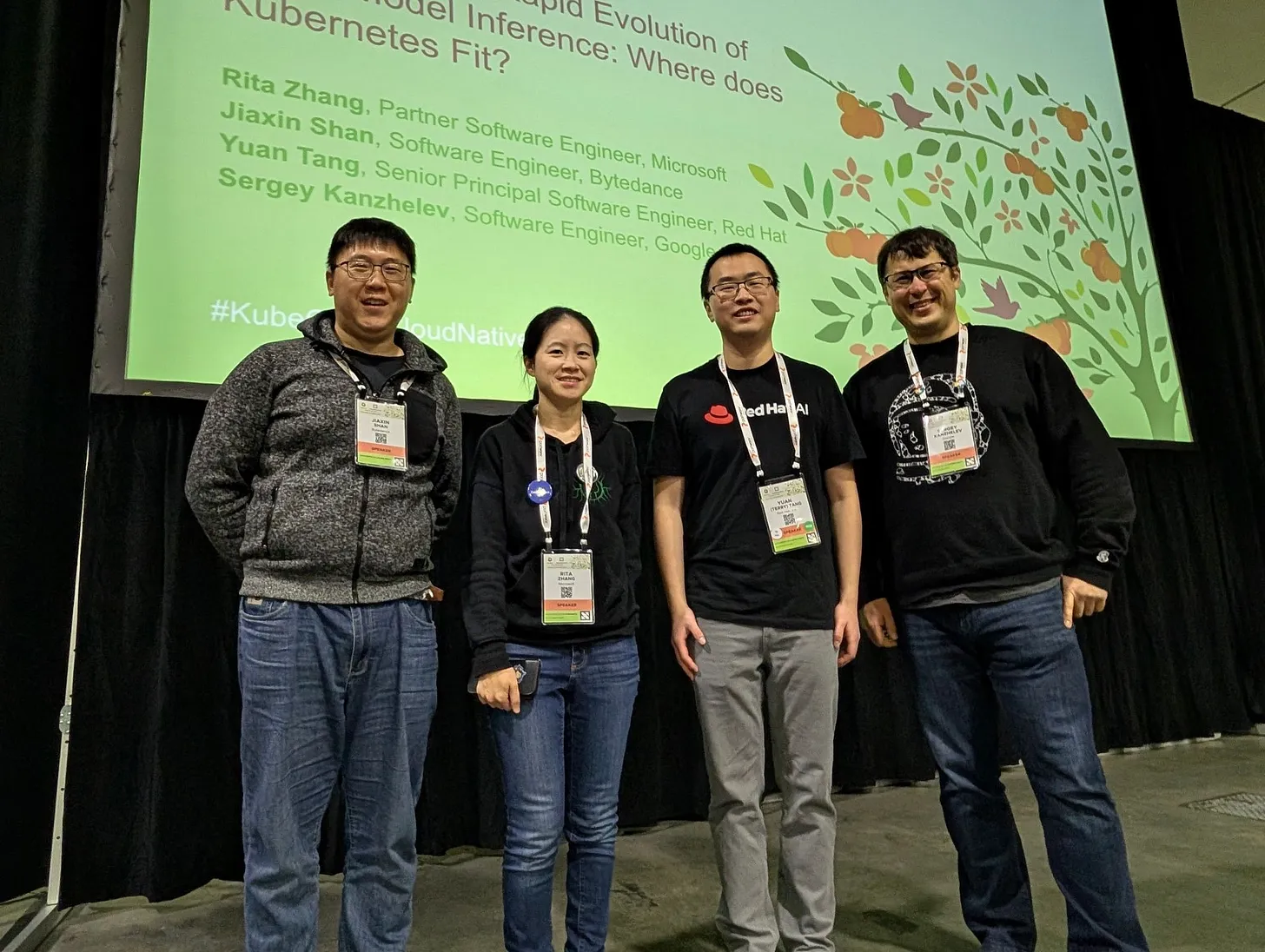 Yuan Tang (Red Hat) shared the current state of model inference on Kubernetes with Rita Zhang (Microsoft), Jiaxin Shan (Bytedance), and Sergey Kanzhelev (Google) as well as efforts and initiatives from K8s WG Serving.